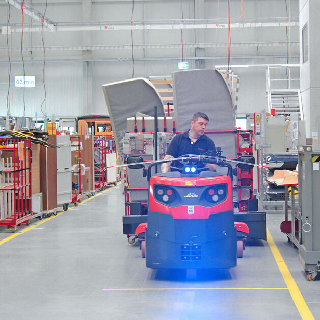 Philip Roltsch, Logistikleiter, ist von dem Factory Train Routenzug von Neumaier begeistert: „Der Routenzug ist hier das Herz-Kreislauf-System. Das Herz ist die Produktion. Und das Kreislauf-System ist unser Routenzug. Ab dem ersten Tag wo der Routenzug in Betrieb genommen wurde, hat er die Aufgaben hervorragend meistern können und somit sind wir auch mehr als Glücklich mit dem Routenzug, der hier jetzt unterwegs ist.“